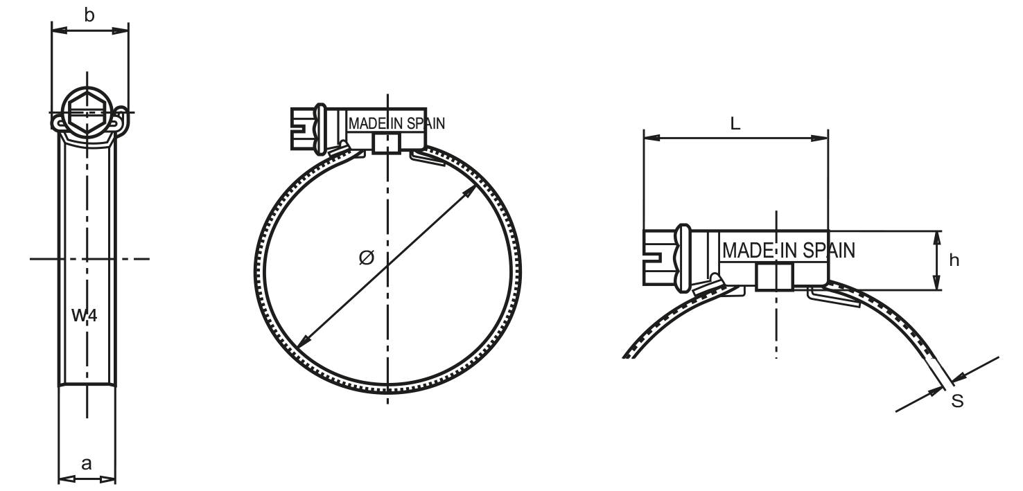 | Material | • Cinta y Cabezal: Acero Inoxidable X5Cr Ni1810 (AISI-304) • Tornillo: Acero Inoxidable (AISI-304) |